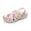 Orchids Graphic design on a white background. There are two different ways to wear these with the back strap behind your heel or in front to slip on easily. Constructed with lightweight and soft but durable rubber EVA material. Anti slip, hard wearing and quick drying. Perfect for camping and outdoor use such as gardening or at the beach. Personally worn and tested. They look much more vibrant in real life. So comfy and really light shoes to wear with light ribbing inside for a foot massage. $20 shipping worldwide due to the bulky nature of these items. Australian sizes are the same as American sizes.