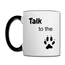 Talk to the Paw. Contrasting handle and inside. Ceramic. Capacity: 11 fl oz. Scratch-proof and durable. Dishwasher safe. Lead & Cadmium free. Printed and processed in the USA. With red, blue or black handle and matching inside. Shipping worldwide. Great for animal lovers. Sold as singles but you could buy all three for a cute little set.