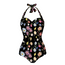 Wildflowers Painted Black design womens halter neck one piece swimsuit. Spandex blend material. Machine wash or hand wash in water temperature below 45ºC, do not bleach, do not iron. Comfortable fabric with pads to shape your breasts and an adjustable neck strap. Please check the size guide carefully to ensure it will fit. Free worldwide shipping.