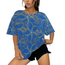 Golden Frangipani Blue women's baggy round neck top. Fabric is Microfiber and Spandex. Longer sleeves which are great for autumn and spring. Vibrant yet pretty print to attract attention.  Australian Women's size 16 is a nice baggy XL. Personally worn and tested. Great tops. Easy care and easy washing.  Check the size chart to make sure it will fit.  FREE WORLDWIDE SHIPPING.