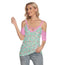 Aqua Floral and Pink top for women with criss cross straps. Fabric is 95% single-knit cotton and 5% spandex. Regular fit. Cold shoulder design, short sleeve, thin shoulder straps, cross straps on chest. Fabric weight: 180g/m². FREE WORLDWIDE SHIPPING.