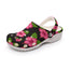 Graphic Pink Hibiscus on a black background design. There are two different ways to wear these with the back strap behind your heel or in front to slip on easily. Constructed with lightweight and soft but durable rubber EVA material. Anti slip, hard wearing and quick drying. Perfect for camping and outdoor use such as gardening or at the beach. Personally worn and tested. They look much more vibrant in real life. So comfy and really light shoes to wear with light ribbing inside for a foot massage. See video how they actually float, making them idea for waterside activities such as boating and fishing. (Video is Leafy Dreams design) $20 shipping worldwide due to the bulky nature of these items. Look for the other versions in different colours. Australian sizes are the same as American sizes.Â
