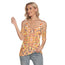 Leopard Fire hand drawn digital art design all over print top for women with criss cross straps. Fabric is 95% single-knit cotton and 5% spandex.  Regular fit.  Cold shoulder style, short sleeve, thin shoulder straps, cross straps on chest.  Unique and different. Fabric weight: 180g/m².  FREE SHIPPING WORLDWIDE.