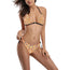 Leopard Fire hand drawn digital art design halter neck bikini. Black strap version. Look for the white straps version too. Padded bra. Features a front buckle design making it easy to take on and off. Spandex blend.