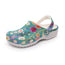 Teal Colourful Floral design. There are two different ways to wear these with the back strap behind your heel or in front to slip on easily. Constructed with lightweight and soft but durable rubber EVA material. Anti slip, hard wearing and quick drying. Perfect for camping and outdoor use such as gardening or at the beach. Personally worn and tested. They look much more vibrant in real life. So comfy and really light shoes to wear with light ribbing inside for a foot massage. $20 shipping worldwide due to the bulky nature of these items.  Australian sizes are the same as American sizes.
