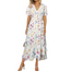 Wildflowers Painted White Floral long dress that is made from Chiffon and Spandex light and breezy fabric. High waist, cute sleeves and asymettical ruffle trim at the bottom. Wrap belt at the waist and a high split on one side. Easy hand or machine washable. Check the size chart to ensure it will fit. Suitable for taller ladies. Look for the shorter version in the same style.  FREE WORLDWIDE SHIPPING.