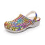 Windswept Rainbows Stained Glass hand drawn digital art design. There are two different ways to wear these with the back strap behind your heel or in front to slip on easily. Constructed with lightweight and soft but durable rubber EVA material.  Anti slip, hard wearing and quick drying. Perfect for camping and outdoor use such as gardening or at the beach. Personally worn and tested.  They look much more vibrant in real life.  So comfy and really light shoes to wear with light ribbing inside for a foot massage. Video is Leafy Dreams design. $20 shipping worldwide due to the bulky nature of these items. Australian sizes are the same as American sizes.